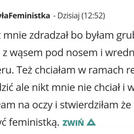 ei byłafeministka dzisiaj       mój mąż mnie zdradzał bo byłam gruba brzydka z wąsem pod nosem i wredna z charakteru też chciałam w ramach rewanżu go zdradzić ale nikt mnie nie chciał i wtedy przejrzałam na oczki stwierdziłam że nie warto być feministką. zwm i a